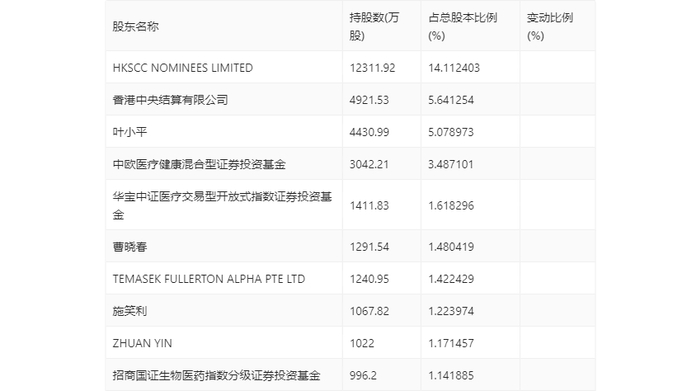 年报显示,2023年年末公司十大流通股东中,新进股东为ZHUAN YIN,取代了三季度末的中欧医疗创新股票型证券投资基金。在具体持股比例上,HKSCC NOMINEES LIMITED、香港中央结算有限公司、中欧医疗健康混合型证券投资基金、华宝中证医疗交易型开放式指数证券投资基金、TEMASEK FULLERTON ALPHA PTE LTD、招商国证生物医药指数分级证券投资基金持股有所下降。