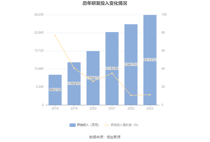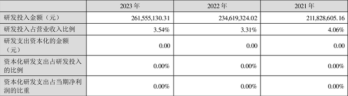 2023年全年,公司研发投入金额为2.62亿元,同比增长11.48%;研发投入占营业收入比例为3.54%,相比上年同期上升0.23个百分点。此外,公司全年研发投入资本化率为0。