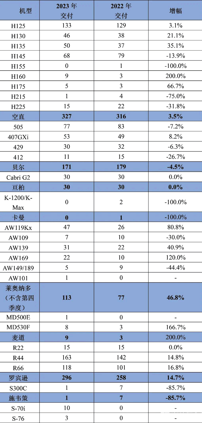 2023年全球民用直升机各机型交付情况(单位:架)李昊2023年度民用直升机市场保持增长势头,交付数量比2022年增长9.8%,交付产品总产值比2022年增长11.2%。制造商方面,空客直升机公司、莱昂纳多直升机公司的市场优势明显,贝尔、罗宾逊、西科斯基等制造商也有一定销量。市场年度表现2023年,全球民用直升机年度交付数量为963架,比2022年度增长9.8%;交付产品总产值为44.01亿美元,比2022年度增长11.2%,市场持续复苏。制造商方面,空客直升机公司仍然牢牢占据市场榜首位置,交付量占市场总量32.8%,产值占47.6%。其余几大制造商分别为莱昂纳多、贝尔、罗宾逊、西科斯基。以上5家制造商垄断了全球市场95.86%的产量和99.09%的产值。与2022年相比,2023年度民用直升机市场总体呈现出进一步回暖的趋势,产量产值分别有9.8%和11.2%的提升。其中莱昂纳多和西科斯基2家公司的产量产值提升明显,成为市场的主要增长点,具体到产品方面则是AW139、AW169和S-70i的销量提升。尽管市场上的制造商份额排名没有变化,但多家制造商的产量产值均有一定波动,其中莱昂纳多、西科斯基2家制造商销量激增。莱昂纳多直升机公司的产量产值均有较大增幅,分别为46.8%和30.2%,西科斯基公司的市场表现也有所恢复,由于2022年交付量基数较小,其产量产值增幅达到了300%和257.4%。其他制造商市场销售情况基本保持稳定。由于海上油气开采需求增长等原因,2023年度民用直升机产品,特别是更为先进、性能更强的新研机型的销量开始增长。例如,6吨级的AW139产量提高约50%,H160产量增加2倍,5吨级产品如AW169也有较大幅度增长,S-76也恢复了交付。但大型机市场则起色不大,主力产品H225、S-92交付量均有所下降。2023年度产量增幅较大的多为近年上市的新研产品,其中H160作为2022年度上市的最新产品,在2023年度获得了包括美国在内的多个国家适航认证,销量也从2022年度的3架机增长至9架机(该机所在的6吨级市场的绝对霸主AW139 销量为31架机)。莱昂纳多公司的新产品AW169的销量也有较大增幅,从2022年度的10架增长至22架,填补了“海豚”停产留下的市场空缺,并超过了5吨级市场上的2个传统机型贝尔212和S-76。重点产品项目进展空直公司全新研制的6吨级民用直升机H160于2020年获得欧洲EASA适航认证以来一直在努力拓展美国等海外市场。2023年6月,H160获得美国FAA适航认证,12月获得加拿大和马来西亚民航局认证。与之同时,H160也获得大量订货,2023年4月获得我国捷德航空的50架采购合同,9月获得美国最大的通航公司之一 PHI公司的8架采购订单。其豪华型ACH-160也于3月交付了首架,交付客户是沙特阿拉伯的THC公司。AW609在美国和欧洲2个主要地区的适航取证和生产工作取得进展。2023年2月,FAA的飞行员完成了AW609的型号检查预核准pre-TIA飞行试验。3月和7月,莱昂纳多公司两次邀请EASA飞行员参加AW609项目活动,驾驶AW609完成了飞行。5月,莱昂纳多公司与Westar公司达成协议,后者将租赁AW609在东南亚地区开展飞行业务。6月,莱昂纳多完成了AW609 最终生产构型的首飞。这些工作进一步推进了AW609的取证和交付工作进程。2023年度多家公司开始验证生态可持续航空燃料的可行性。贝尔505于2月开展了使用100%可持续航空燃料SAF的飞行试验。11月,莱昂纳多在AW139上使用100%的SAF完成了首飞。SAF由废弃食用油和其他生物基原料制成,这次使用的燃料由Neste公司研发,由于含有使用植物糖生产的芳烃,可直接用于常规的航空燃油发动机中。5月和11月,莱昂纳多分别和2家运营商AW139在马来西亚和阿布扎比使用SAF完成了实际飞行任务。未来展望2023年,民用直升机市场继续保持了增长势头,且增幅相比2022年度有所提高,市场产值增幅已达11.2%,预计2024年度将继续保持这一势头。俄乌冲突持续导致的全球能源供应紧张,进而带来的各国加大海上油气资源的勘探和开采力度,已在中大型机市场上得到体现,并将继续促进市场增长。产品方面,由于当前市场总体形势仍处于缓慢恢复阶段,各大制造商对于新产品研发总体上仍将保持谨慎观望的策略,目前已知的仅有贝尔525、AW609等少数几个型号有望上市。未来一段时间内,市场上不太可能有较多新产品甚至新改型项目启动。新兴领域方面,电动垂直起降领域蓬勃发展,产品、技术、供应链的发展十分迅速,且获得大量投资和政策支持,可能成为未来民用直升机产业发展的新契机和主要增长点。同时,高速直升机技术也有望在近期取得进展,其中有望在2024年出现的成就包括AW609完成取证开始投入使用,空客直升机公司的复合推进高速直升机首飞等。(作者单位系中国航空工业发展研究中心)