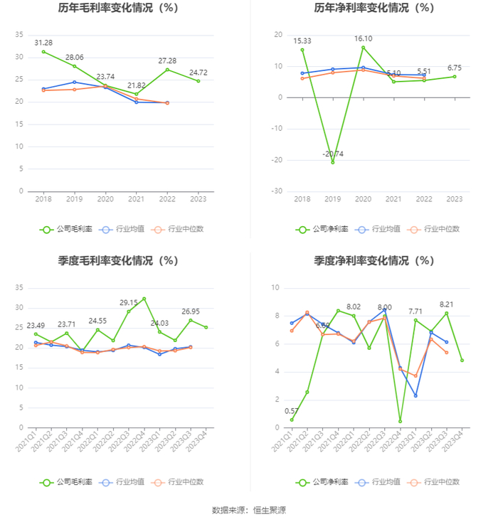 2023年,公司毛利率为24.72%,同比下降2.56个百分点;净利率为6.75%,较上年同期上升1.24个百分点。从单季度指标来看,2023年第四季度公司毛利率为25.18%,同比下降7.19个百分点,环比下降1.77个百分点;净利率为4.83%,较上年同期上升4.37个百分点,较上一季度下降3.38个百分点。