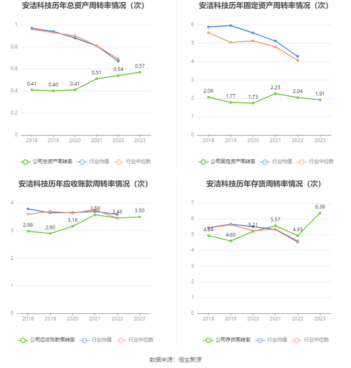营运能力方面,2023年,公司公司总资产周转率为0.57次,上年同期为0.54次(2022年行业平均值为0.67次,公司位居同行业68/94);固定资产周转率为1.91次,上年同期为2.04次(2022年行业平均值为4.28次,公司位居同行业79/94);公司应收账款周转率、存货周转率分别为3.50次、6.38次。