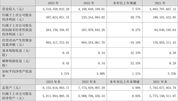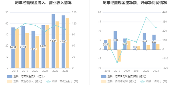2023年,公司经营活动现金流净额为8.03亿元,同比下降10.16%;筹资活动现金流净额-1.96亿元,同比增加5107.90万元;投资活动现金流净额-7.61亿元,上年同期为-3.61亿元。
