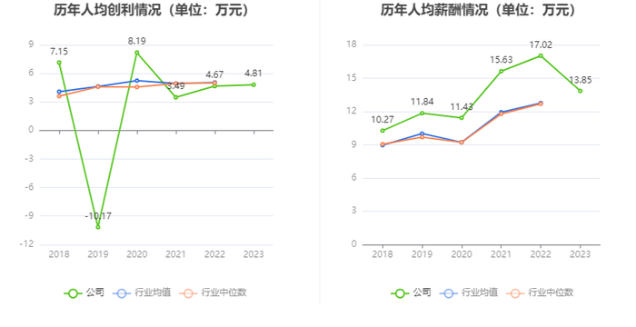 截至2023年末,公司员工总数为6398人,人均创收70.59万元,人均创利4.81万元,人均薪酬13.85万元,较上年同期分别变化-15.29%、2.97%、-18.63%。