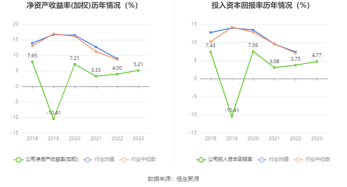 数据显示,2023年公司加权平均净资产收益率为5.21%,较上年同期增长1.21个百分点;公司2023年投入资本回报率为4.77%,较上年同期增长1.02个百分点。