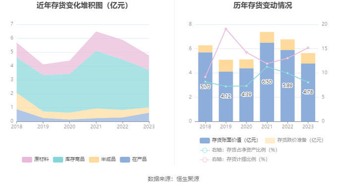 从存货变动来看,截至2023年年末,公司存货账面价值为4.78亿元,占净资产的8.08%,较上年末减少1.11亿元。其中,存货跌价准备为8558.12万元,计提比例为15.19%。