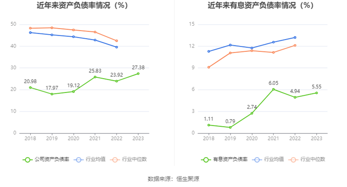 在偿债能力方面,公司2023年年末资产负债率为27.38%,相比上年末上升3.46个百分点;有息资产负债率为5.55%,相比上年末上升0.61个百分点。