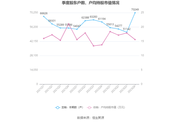 筹码集中度方面,截至2023年年末,公司股东总户数为7.02万户,较三季度末增长了1.91万户,增幅37.36%;户均持股市值由三季度末的17.92万元下降至15.63万元,降幅为12.78%。