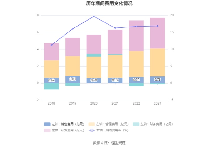 2023年,公司期间费用为7.62亿元,较上年同期增加5887.60万元;期间费用率为16.88%,较上年同期上升0.13个百分点。其中,销售费用同比增长10.08%,管理费用同比增长7.6%,研发费用同比增长0.49%,财务费用由去年同期的-3723.09万元变为-1077.91万元。
