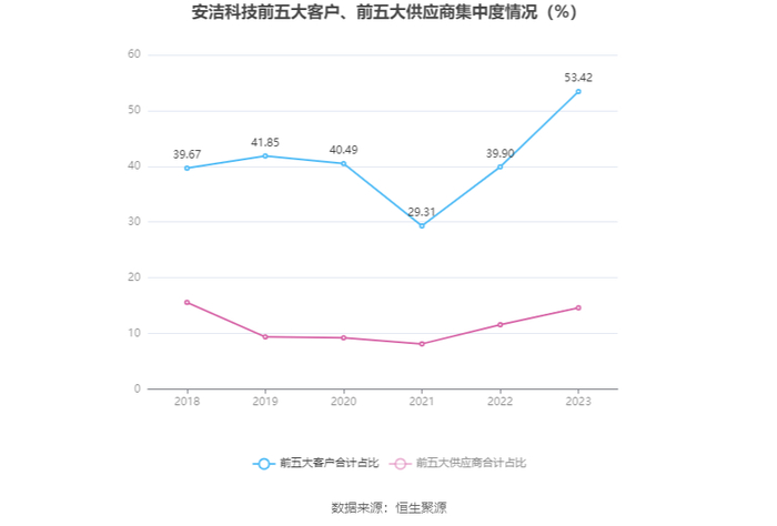 报告期内,公司前五大客户合计销售金额24.13亿元,占总销售金额比例为53.42%,公司前五名供应商合计采购金额4.96亿元,占年度采购总额比例为14.60%。