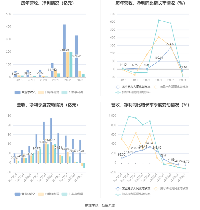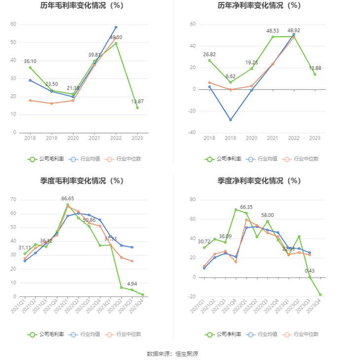 2023年,公司毛利率为13.87%,同比下降35.63个百分点;净利率为13.88%,较上年同期下降35.04个百分点。从单季度指标来看,2023年第四季度公司毛利率为1.39%,同比下降35.64个百分点,环比下降3.55个百分点;净利率为-17.89%,较上年同期下降56.41个百分点,较上一季度下降18.32个百分点。