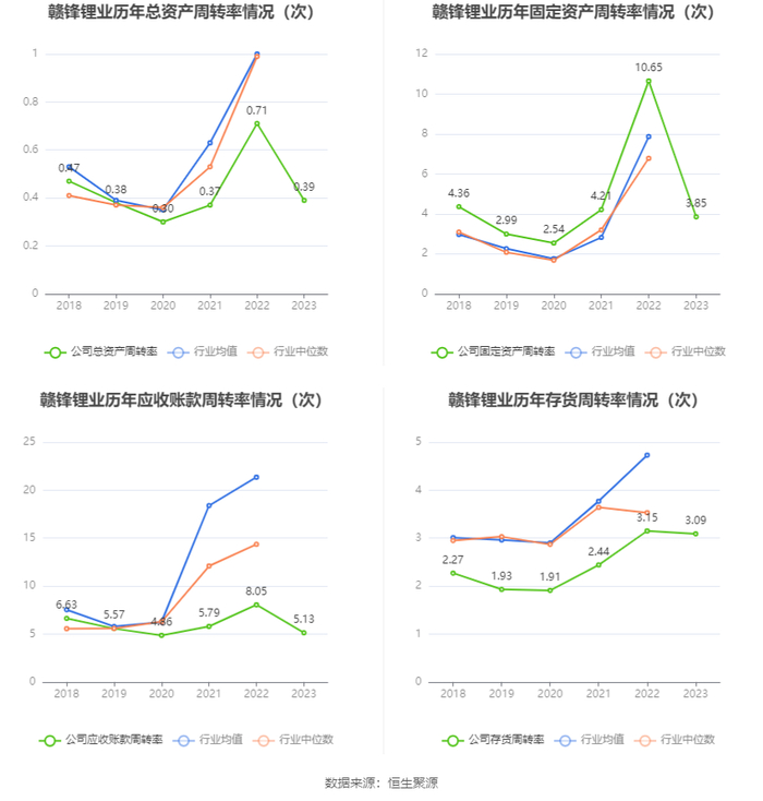 营运能力方面,2023年,公司公司总资产周转率为0.39次,上年同期为0.71次(2022年行业平均值为1.00次,公司位居同行业7/10);固定资产周转率为3.85次,上年同期为10.65次(2022年行业平均值为7.87次,公司位居同行业3/10);公司应收账款周转率、存货周转率分别为5.13次、3.09次。