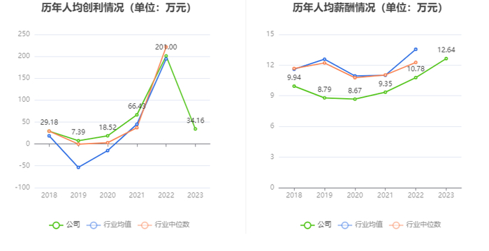 截至2023年末,公司员工总数为14481人,人均创收227.69万元,人均创利34.16万元,人均薪酬12.64万元,较上年同期分别变化-44.46%、-83.00%、17.28%。