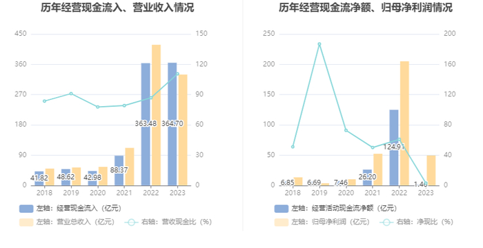 2023年,公司经营活动现金流净额为1.46亿元,同比下降98.83%;筹资活动现金流净额102.18亿元,同比增加38.13亿元;投资活动现金流净额-101.83亿元,上年同期为-153.12亿元。