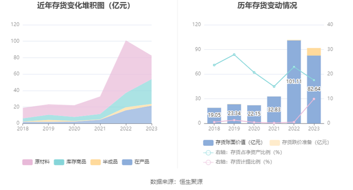 从存货变动来看,截至2023年年末,公司存货账面价值为82.64亿元,占净资产的17.57%,较上年末减少18.47亿元。其中,存货跌价准备为9.12亿元,计提比例为9.94%。