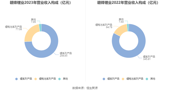 分产品来看,2023年公司主营业务中,锂系列产品收入244.65亿元,同比下降29.25%,占营业收入的74.20%;锂电池系列产品收入77.08亿元,同比增长18.98%,占营业收入的23.38%。