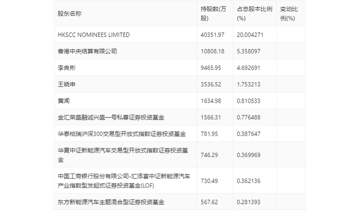 年报显示,2023年年末公司十大流通股东中,新进股东为东方新能源汽车主题混合型证券投资基金,取代了三季度末的富国中证新能源汽车指数型证券投资基金。在具体持股比例上,华泰柏瑞沪深300交易型开放式指数证券投资基金持股有所上升,HKSCC NOMINEES LIMITED、香港中央结算有限公司、华夏中证新能源汽车交易型开放式指数证券投资基金、中国工商银行股份有限公司-汇添富中证新能源汽车产业指数型发起式证券投资基金(LOF)持股有所下降。