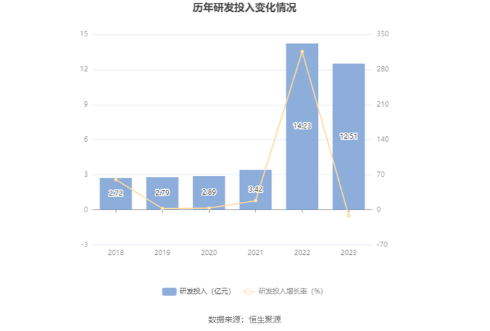 2023年全年,公司研发投入金额为12.51亿元,同比下降12.09%;研发投入占营业收入比例为3.79%,相比上年同期上升0.39个百分点。此外,公司全年研发投入资本化率为0。