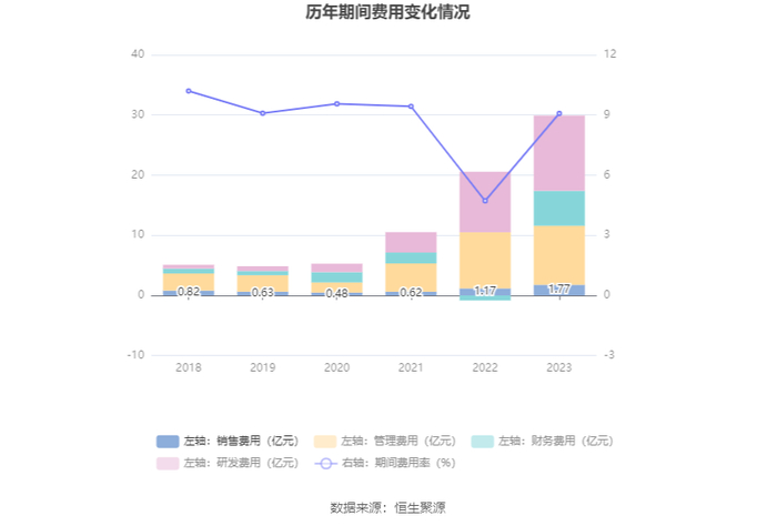 2023年,公司期间费用为29.92亿元,较上年同期增加10.18亿元;期间费用率为9.08%,较上年同期上升4.36个百分点。其中,销售费用同比增长51.19%,管理费用同比增长5.26%,研发费用同比增长24.17%,财务费用由去年同期的-8337.38万元变为5.81亿元。