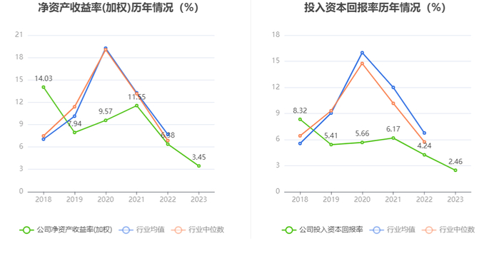 数据显示,2023年公司加权平均净资产收益率为3.45%,较上年同期下降2.93个百分点;公司2023年投入资本回报率为2.46%,较上年同期下降1.78个百分点。