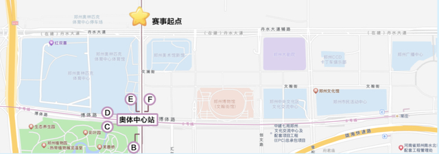 本次赛事欢乐跑起点位于丹水大道长椿南路交叉口(近奥体中心体育馆),欢乐跑终点位于丹水大道创文路东侧(近郑州大剧院北门)。选手们可以乘坐郑州地铁1号线至铁炉站换乘14号线乘坐莲湖方向列车至奥体中心站,从E/F口出站;或是直接乘坐郑州地铁6号线和14号线至奥体中心站,从E/F口出站。