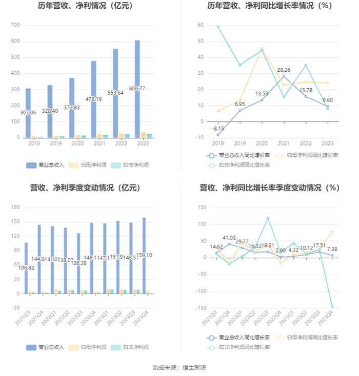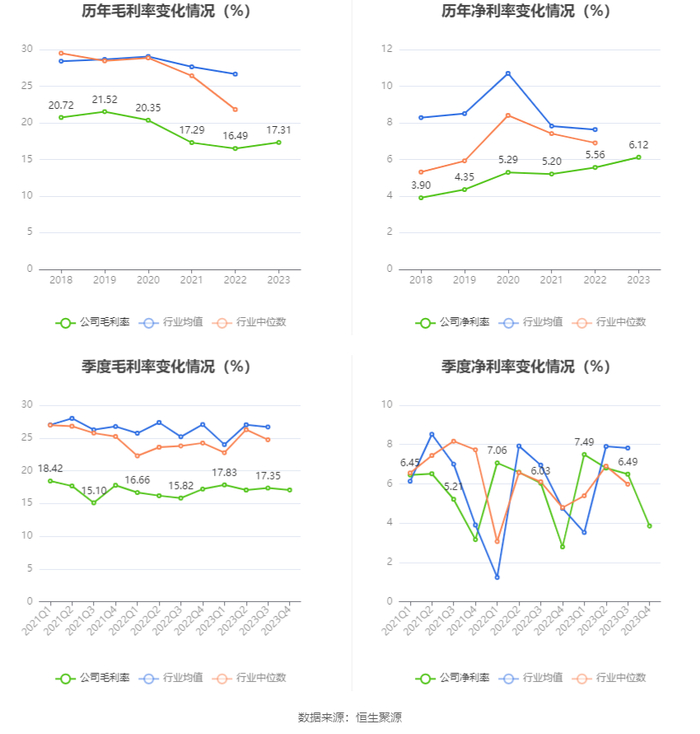 2023年,公司毛利率为17.31%,同比上升0.82个百分点;净利率为6.12%,较上年同期上升0.56个百分点。从单季度指标来看,2023年第四季度公司毛利率为17.06%,同比下降0.13个百分点,环比下降0.29个百分点;净利率为3.85%,较上年同期上升1.06个百分点,较上一季度下降2.64个百分点。