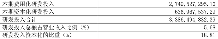 2023年全年,公司研发投入金额为33.86亿元,同比增长9.08%;研发投入占营业收入比例为5.68%,相比上年同期下降0.05个百分点。此外,公司全年研发投入资本化率为18.81%。