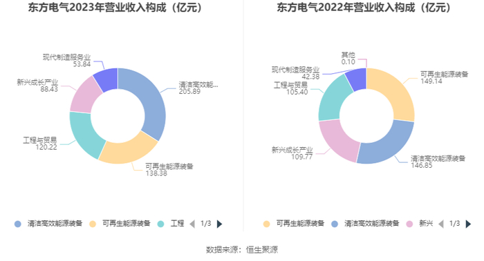 分产品来看,2023年公司主营业务中,清洁高效能源装备收入205.89亿元,同比增长40.21%,占营业收入的33.93%;可再生能源装备收入138.38亿元,同比下降7.22%,占营业收入的22.81%;工程与贸易收入120.22亿元,同比增长14.06%,占营业收入的19.81%。