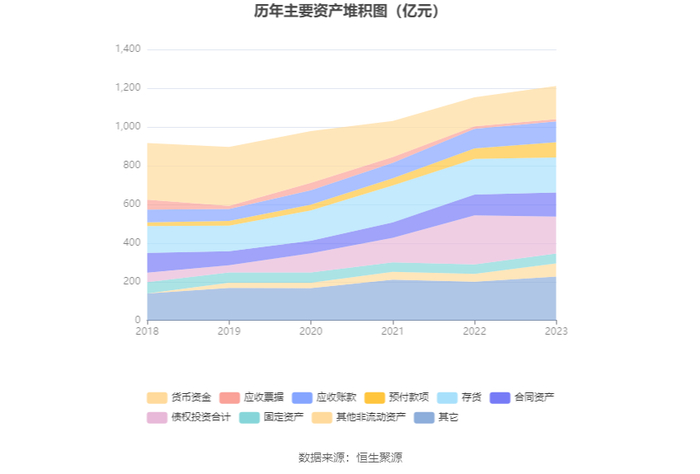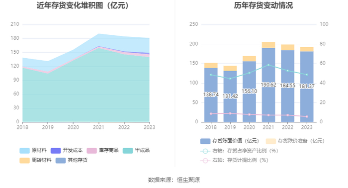 从存货变动来看,截至2023年年末,公司存货账面价值为181.37亿元,占净资产的48.7%,较上年末减少3.19亿元。其中,存货跌价准备为11.01亿元,计提比例为5.72%。