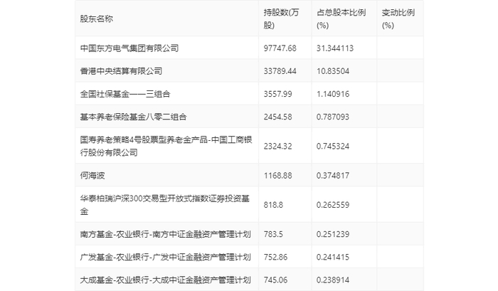 年报显示,2023年年末公司十大流通股东中,持股最多的为中国东方电气集团有限公司,占比31.34%。十大流通股东名单相比2023年三季报维持不变。在具体持股比例上,中国东方电气集团有限公司、基本养老保险基金八零二组合、华泰柏瑞沪深300交易型开放式指数证券投资基金持股有所上升。