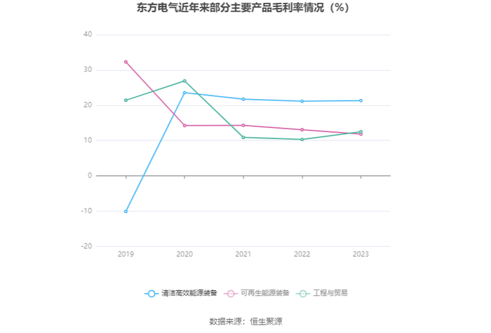 分产品看,清洁高效能源装备、可再生能源装备、工程与贸易2023年毛利率分别为21.33%、11.84%、12.49%。