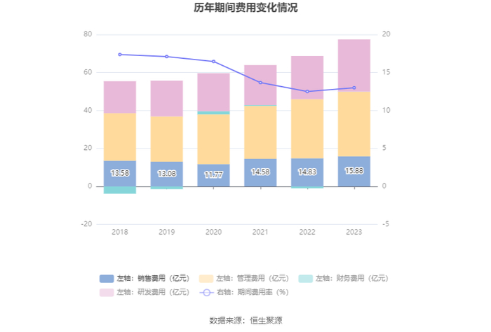2023年,公司期间费用为77.48亿元,较上年同期增加9.71亿元;期间费用率为13.01%,较上年同期上升0.50个百分点。其中,销售费用同比增长7.01%,管理费用同比增长9.2%,研发费用同比增长20.85%,财务费用由去年同期的-9783.45万元变为745.20万元。
