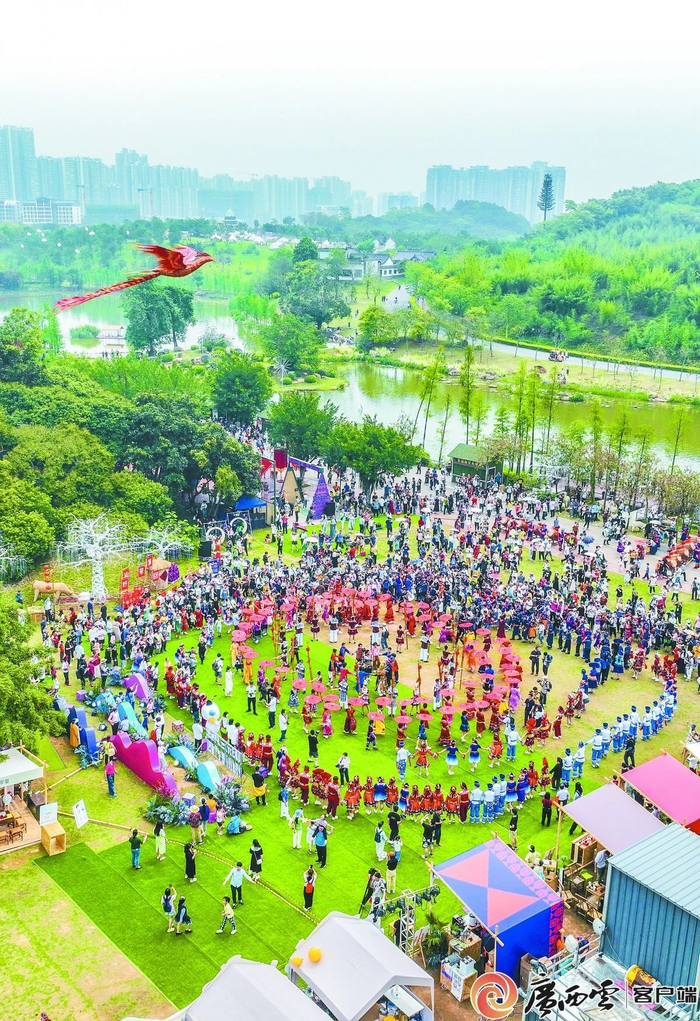 2023年“壮族三月三八桂嘉年华”开幕式上,青秀山花团锦簇、歌舞萦绕、美食飘香,俨然一片欢乐的海洋。记者 周军 摄。资料图片