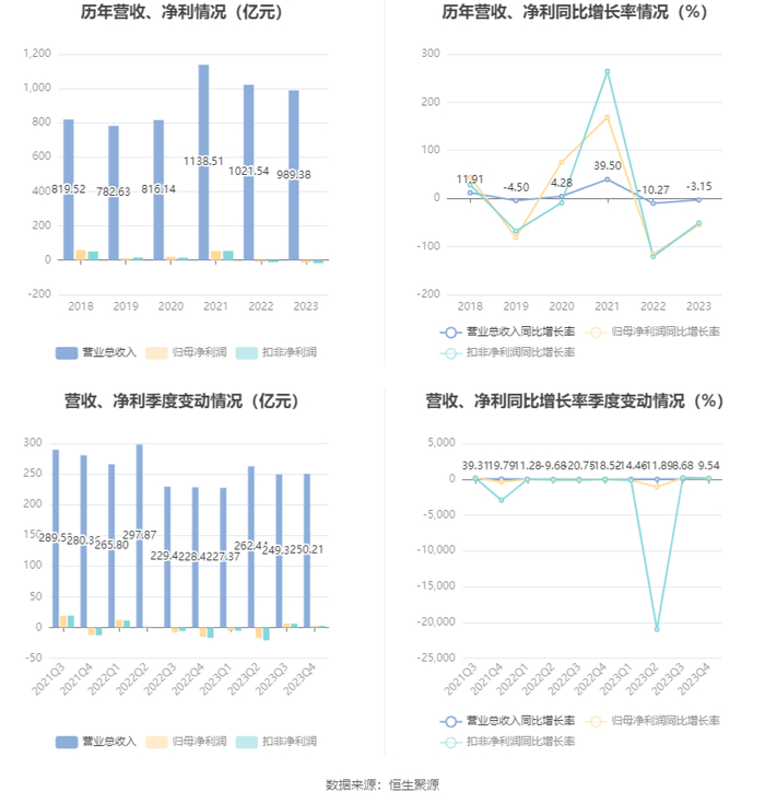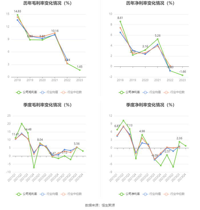 2023年,公司毛利率为1.65%,同比下降1.59个百分点;净利率为-1.66%,较上年同期下降0.86个百分点。从单季度指标来看,2023年第四季度公司毛利率为3.14%,同比上升4.60个百分点,环比下降2.42个百分点;净利率为0.82%,较上年同期上升7.37个百分点,较上一季度下降1.54个百分点。
