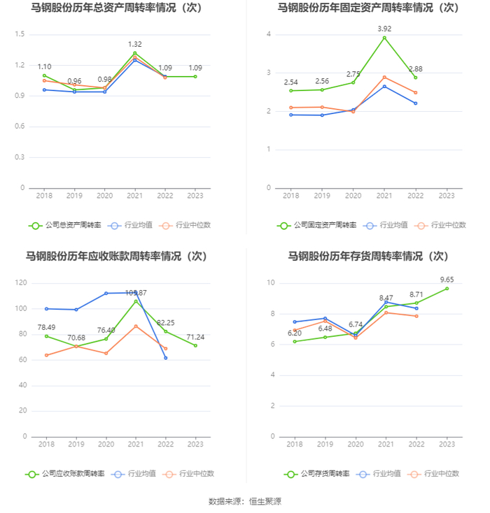 营运能力方面,2023年,公司公司总资产周转率为1.09次,上年同期为1.09次(2022年行业平均值为1.09次,公司位居同行业8/17);公司应收账款周转率、存货周转率分别为71.24次、9.65次。