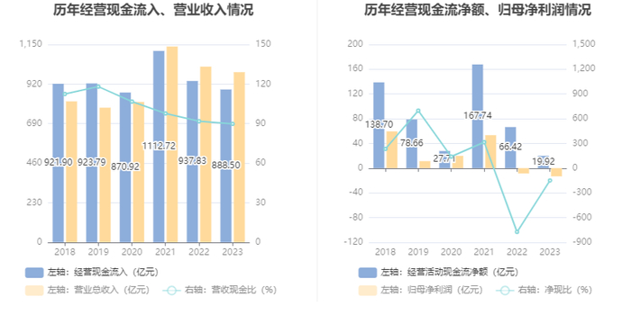 2023年,公司经营活动现金流净额为19.92亿元,同比下降70.01%;筹资活动现金流净额-13.61亿元,同比减少18.78亿元;投资活动现金流净额-5.61亿元,上年同期为-70.98亿元。