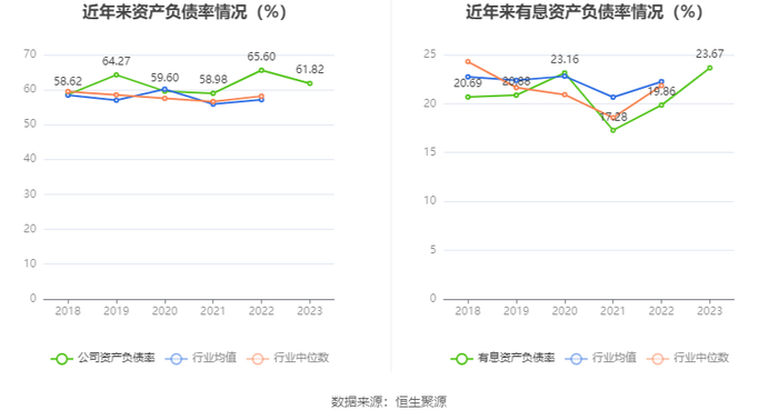 在偿债能力方面,公司2023年年末资产负债率为61.82%,相比上年末下降3.78个百分点;有息资产负债率为23.67%,相比上年末上升3.81个百分点。