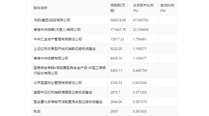 年报显示,2023年年末公司十大流通股东中,新进股东为国金量化多策略灵活配置混合型证券投资基金,取代了三季度末的申万宏源证券有限公司。在具体持股比例上,马钢(集团)控股有限公司、香港中央结算(代理人)有限公司、中央汇金资产管理有限责任公司、香港中央结算有限公司、国寿养老策略4号股票型养老金产品-中国工商银行股份有限公司、北京国星物业管理有限责任公司、张武持股有所上升,上证红利交易型开放式指数证券投资基金、富国中证红利指数增强型证券投资基金持股有所下降。