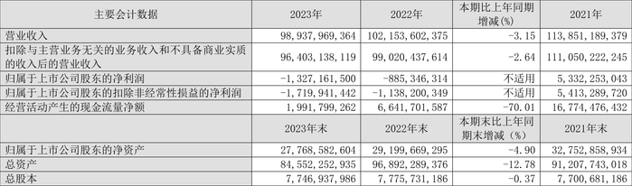 数据显示,2023年公司加权平均净资产收益率为-4.67%,较上年同期下降1.90个百分点;公司2023年投入资本回报率为-2.00%,较上年同期下降1.79个百分点。