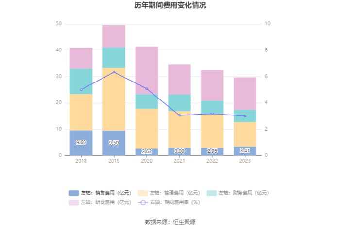 2023年,公司期间费用为29.73亿元,较上年同期减少2.73亿元;期间费用率为3.00%,较上年同期下降0.18个百分点。其中,销售费用同比增长15.62%,管理费用同比下降26.14%,研发费用同比增长5.46%,财务费用同比下降10.12%。