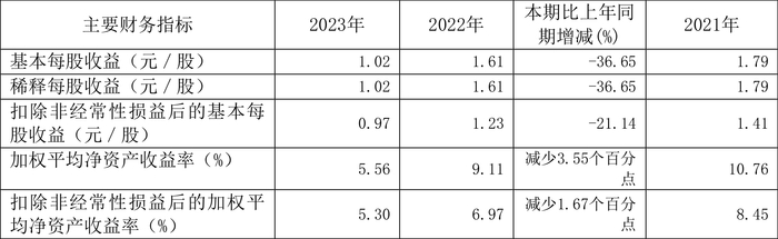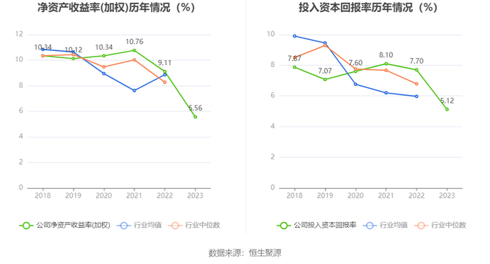 数据显示,2023年公司加权平均净资产收益率为5.56%,较上年同期下降3.55个百分点;公司2023年投入资本回报率为5.12%,较上年同期下降2.58个百分点。