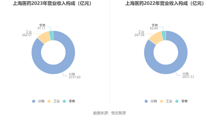分产品来看,2023年公司主营业务中,分销收入2337.60亿元,同比增长13.62%,占营业收入的89.81%;工业收入262.57亿元,同比下降1.87%,占营业收入的10.09%;零售收入91.11亿元,同比增长10.25%,占营业收入的3.50%。