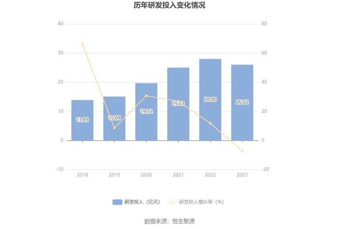 2023年全年,公司研发投入金额为26.02亿元,同比下降7.07%;研发投入占营业收入比例为9.91%,相比上年同期下降0.56个百分点。此外,公司全年研发投入资本化率为15.30%。
