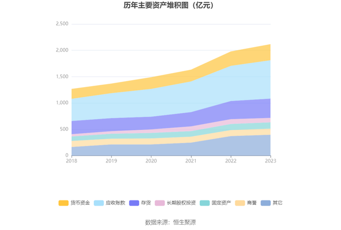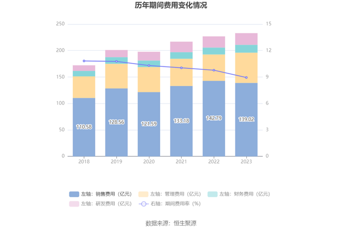 2023年,公司期间费用为233.04亿元,较上年同期增加6.08亿元;但期间费用率为8.95%,较上年同期下降0.83个百分点。其中,销售费用同比下降2.64%,管理费用同比增长14.43%,研发费用同比增长4.35%,财务费用同比增长13.14%。