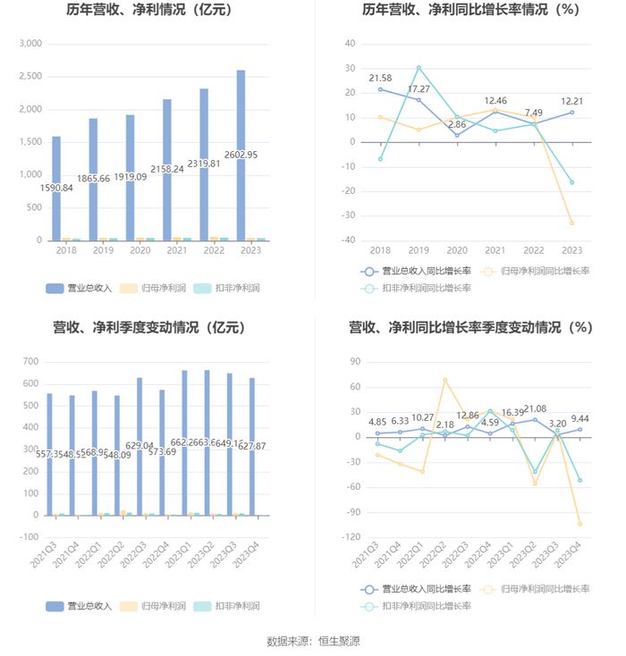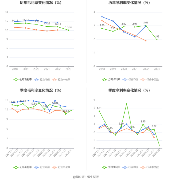 2023年,公司毛利率为12.04%,同比下降1.10个百分点;净利率为1.98%,较上年同期下降1.03个百分点。从单季度指标来看,2023年第四季度公司毛利率为11.73%,同比下降1.88个百分点,环比上升1.10个百分点;净利率为0.34%,较上年同期下降1.42个百分点,较上一季度下降2.03个百分点。
