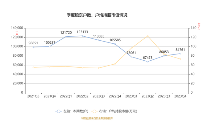 筹码集中度方面,截至2023年末,公司股东总户数为8.48万户,较三季度末增长了4708户,增幅5.88%;户均持股市值由三季度末的83.64万元下降至73.1万元,降幅为12.61%。