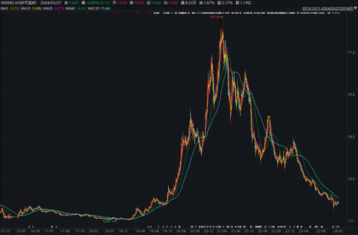 截至3月27日收盘,妙可蓝多报收于13.63元/股,较历史最高点下跌83.87%,今年以来股价累计下跌15.18%,当前总市值为70.02亿元。