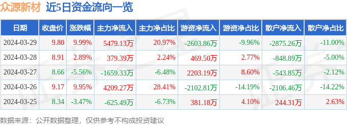 3月29日的资金流向数据方面,主力资金净流入5479.13万元,占总成交额20.97%,游资资金净流出2603.86万元,占总成交额9.96%,散户资金净流出2875.26万元,占总成交额11.0%。