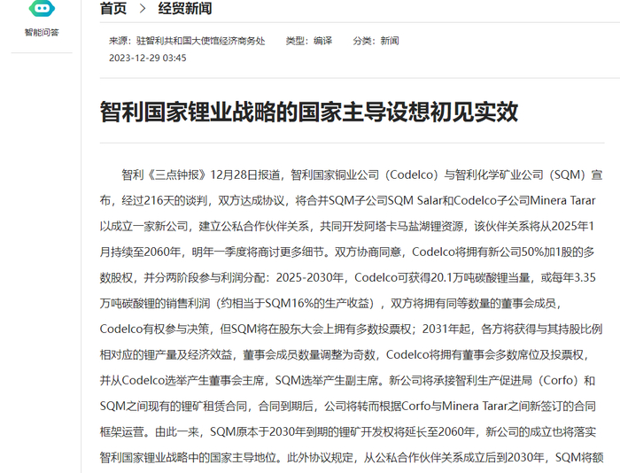 盐湖提锂巨头SQM将与智利国企“公私合营” 天齐锂业此前要求召开股东会听取谈判状况