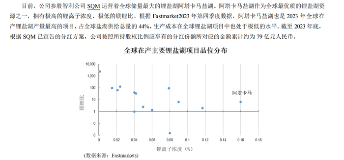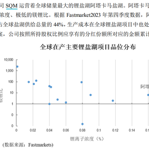 SQM运营全球储量最大的锂盐湖阿塔卡马项目,其资源量约1080万吨金属锂当量,资源量和品位居全球前列。根据Fastmarket2023年第四季度数据,阿塔卡马盐湖也是2023年全球在产锂盐湖产量最高的项目,占全球盐湖供给总量的44%,生产成本在全球锂盐湖项目中也处于极低的水平。