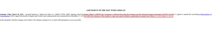 就在2月28日,SQM宣布年度股东大会日期为4月25日。宣布年度股东大会召开时间当天,SQM同时披露,天齐智利(Inversiones TLC SpA)要求召开特别股东大会,以听取SQM与智利国家铜业公司之间,对2023年12月27日的谅解备忘录所述的谈判状况。其次是根据上述谅解备忘录预计将执行行动和合同详细信息,以及与同一事项相关主题。最终SQM董事会同意于3月21日星期四上午10时(智利时间)召开临时股东大会。